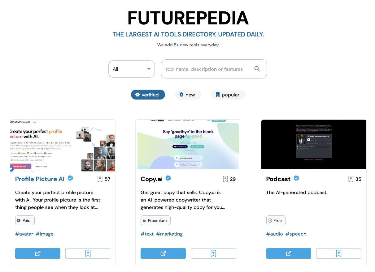 Futurepedia är världens största (antagligen) databas av AI-verktyg. Med över 1300 verktyg i 50 olika kategorier kan du antagligen hitta vilken typ av AI-verktyg som helst.